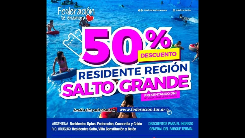 Si vives en los Departamentos de la Región Salto Grande, ¡puedes obtener un 50% de descuento en tu entrada! Esto incluye a los residentes de los departamentos Federación, Concordia, Colón y las localidades del vecino país Uruguay: Salto, Villa Constitución y Belén.